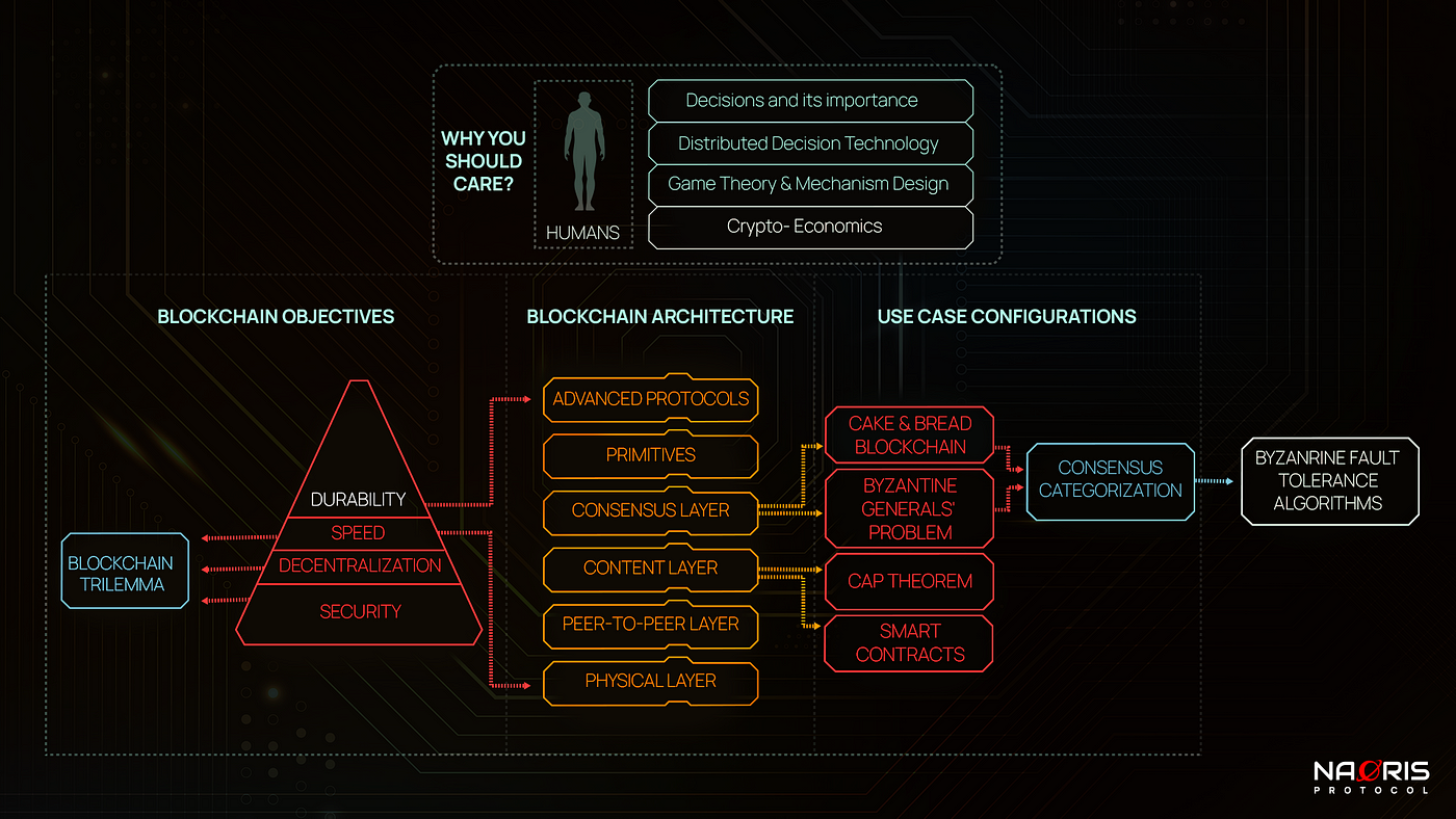 The picture may serve as a framework for understanding any blockchain. We will be building more and more on this framework (mind map / mental image as we progress). Eventually, you will be able to represent any blockchain by inputing different parameters in the various sections of the image to arrive at the configuration you want, while keeping in mind the trade-offs.