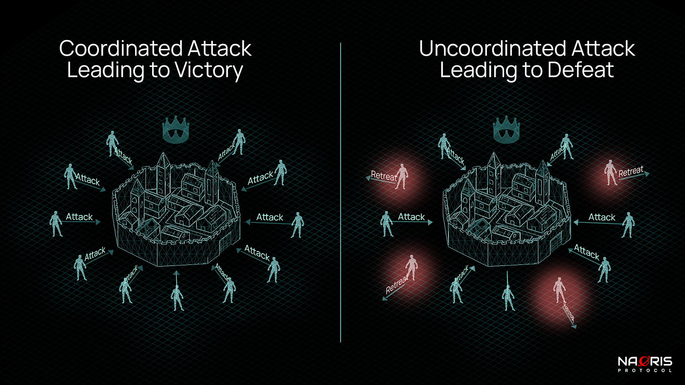 A battalion of enemy Generals have surrounded the city in dispersed groups, and they need to decide on a common strategy (and a set of tactics) to successfully attack/take the city. However, they face a critical problem: