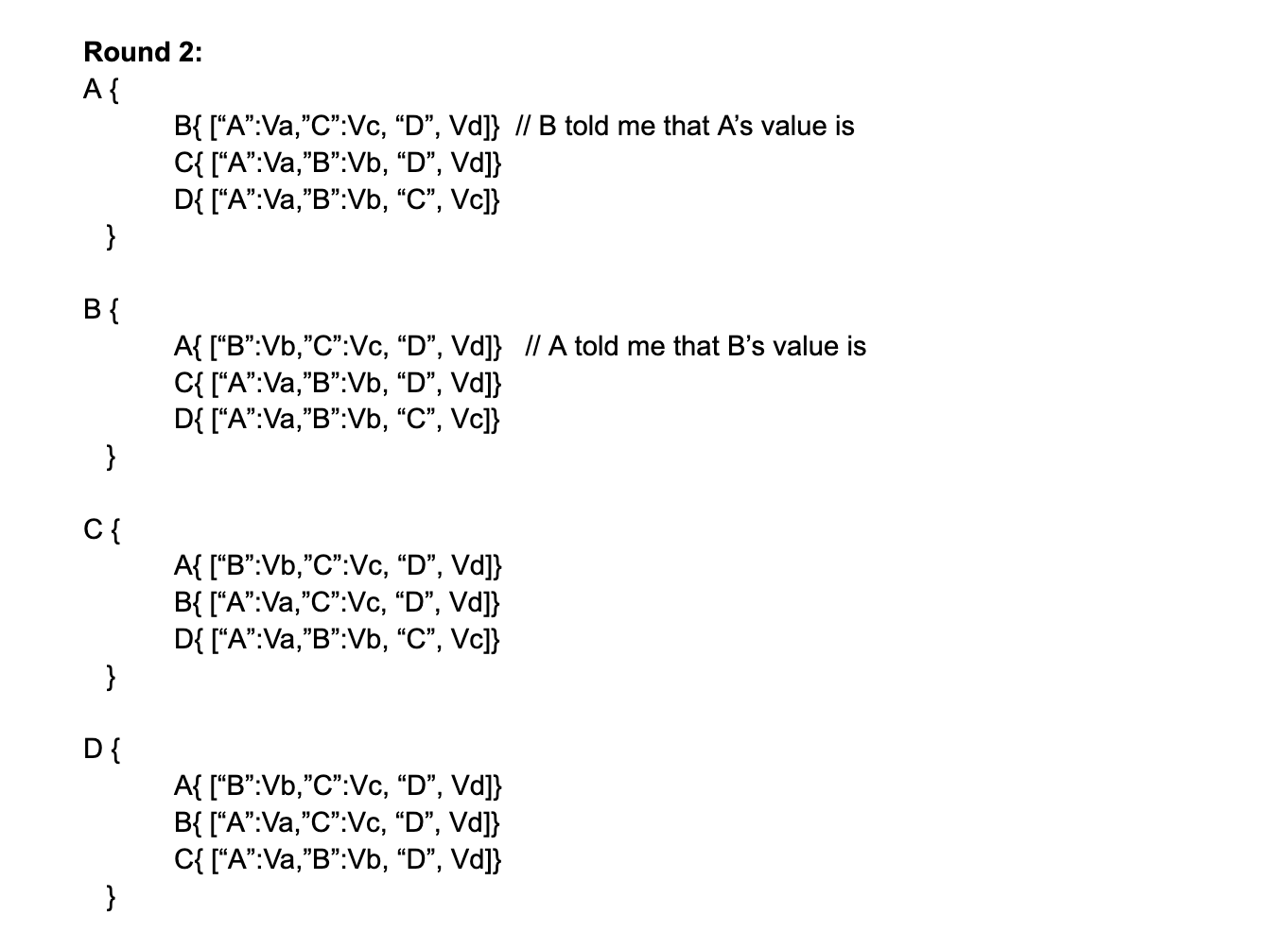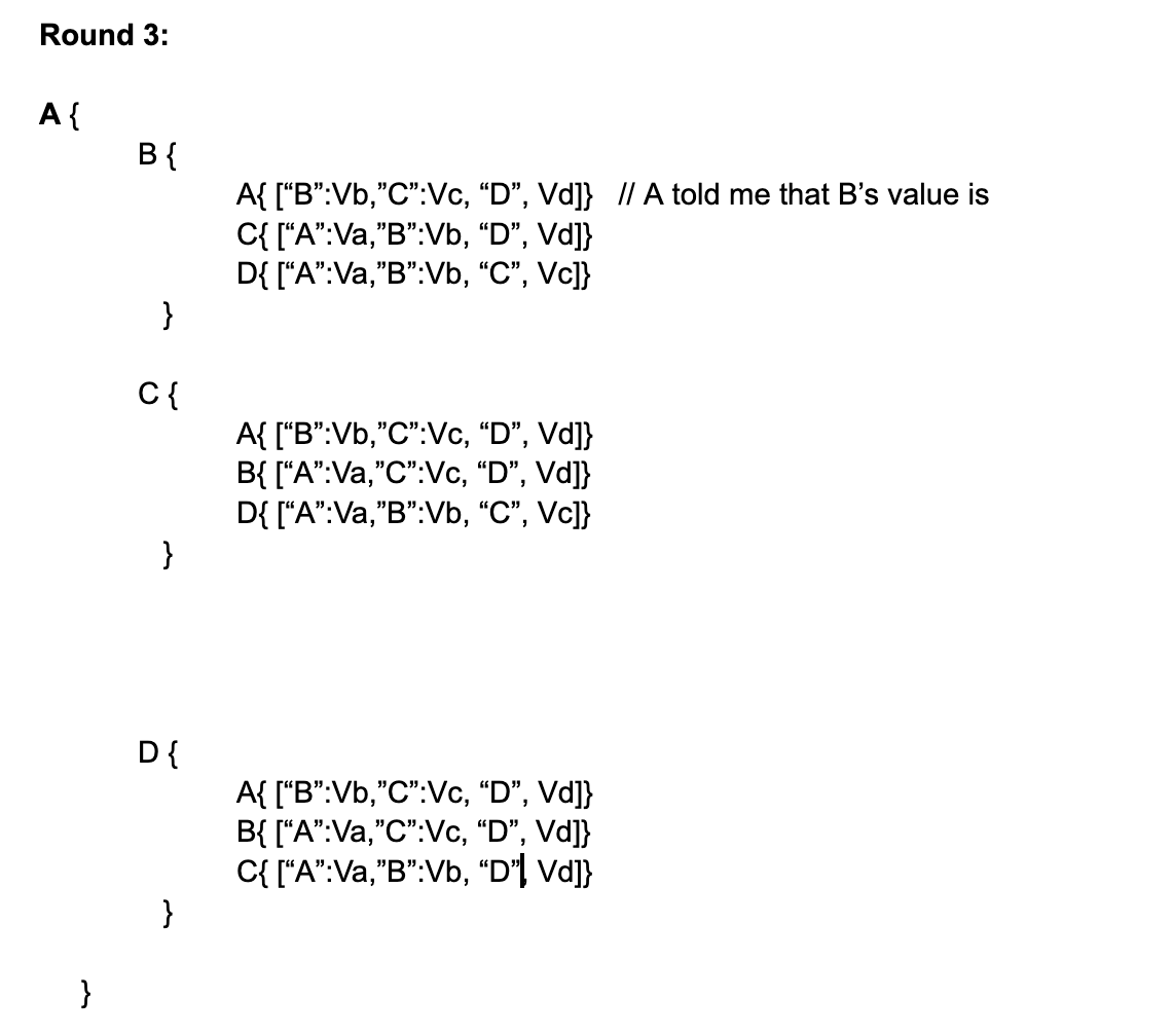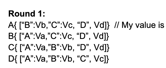Remember that after all rounds, all nodes will choose the value of the secrets which is most consistent for all nodes. So example: <A:Va, B:Vb, C:Null, D, Vd>. This means throughout the rounds, most people said A’s secret was Va, B’s secret was Vb, C’s secret could not be determined so Null, D’s was Vd. Every node should come to the same vector. This is the Interactive Consistency Vector.